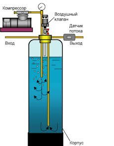 Состоят аэрационные колонны из компрессора, сепарационной емкости, датчика потока воды и устройства отвода лишнего газа. Воздушная смесь проникает внутрь колонны с помощью компрессора.